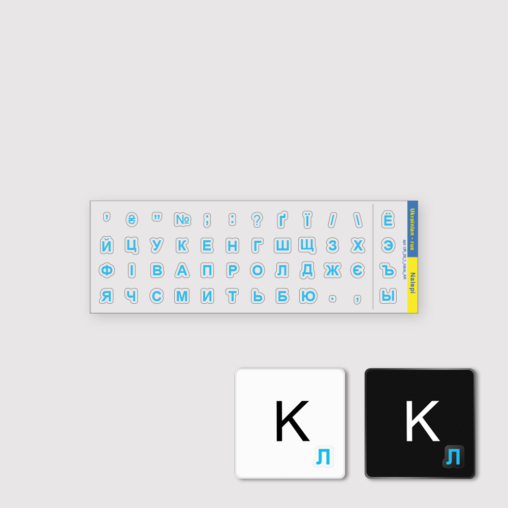Нестираючі наклейки на клавіатуру Кирилиця UA | ru 13 х 13 мм прозоре тло / блакитні символи (підходить для macbook)
