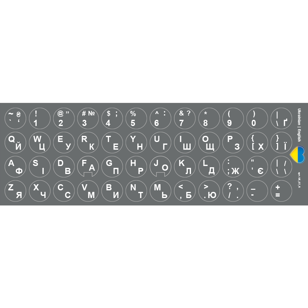 Круглі довговічні наклейки на клавіатуру Українська / Англійська d=13 мм сіре тло Nalepi (підходять Logitech K380s)
