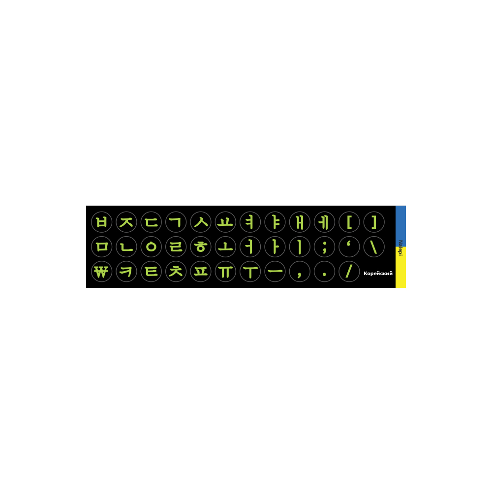 Мікро-наклейки на клавіатуру з корейськими символами на чорному тлі відмінно підійдуть для темної клавіатури, тому що салатові символи добре видно на темному фоні.